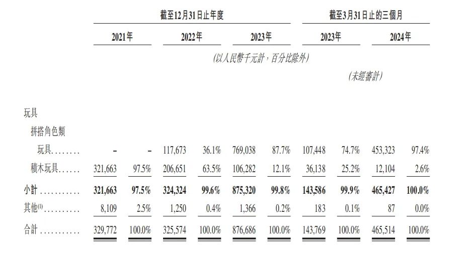 其中,“积木玩具”在2021年贡献了几乎全部的收入,占比97.5%。自2022年起,“拼搭角色类玩具”开始录入营收,占2022年总收入的36.1%。