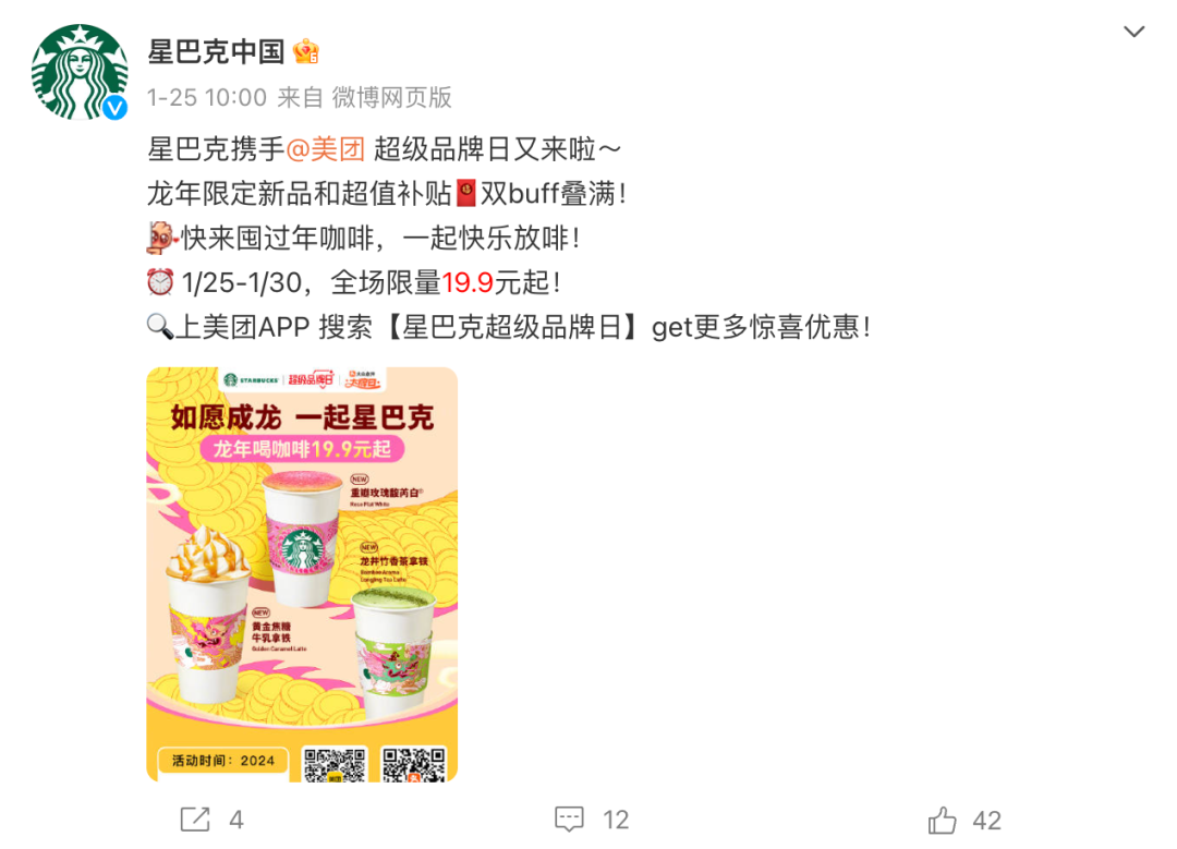 ▲ 星巴克加入“战争”,上架19.9元限时优惠。图 / 星巴克微博