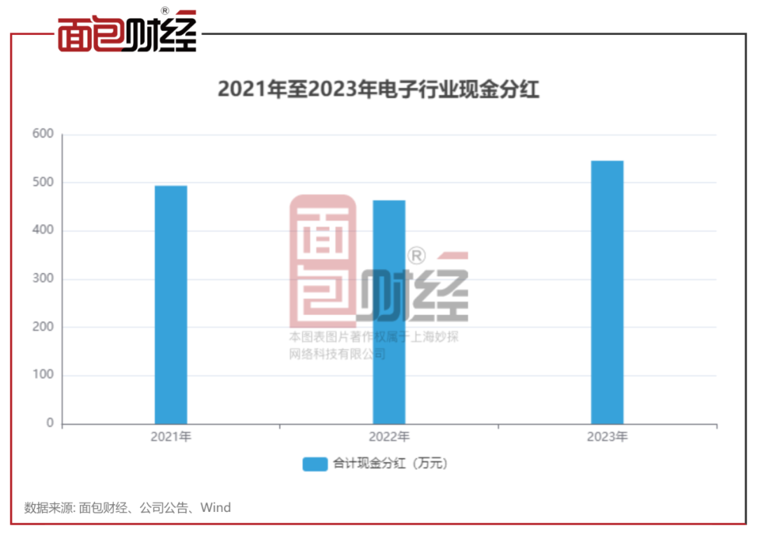 面包财经梳理公开资料显示,按照申万一级行业分类,电子行业企业2023年现金派息金额(不包括回购等视同现金分红的情况,下同)合计545.6亿元,较2022年增加约82亿元。