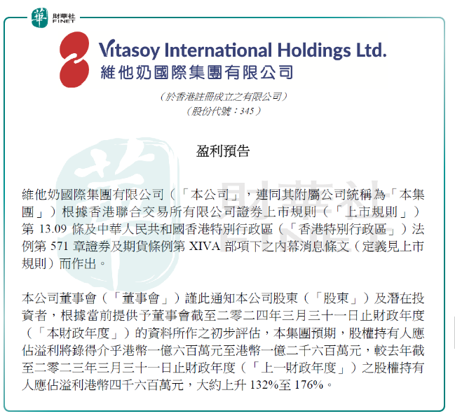 消息面上,维他奶国际发布公告称,预期截至2024年3月31日止财政年度(2024财年)归母净利润为1.06亿港元至1.26亿港元,同比大约上升132%至176%。