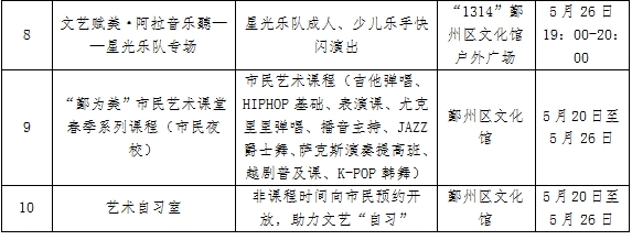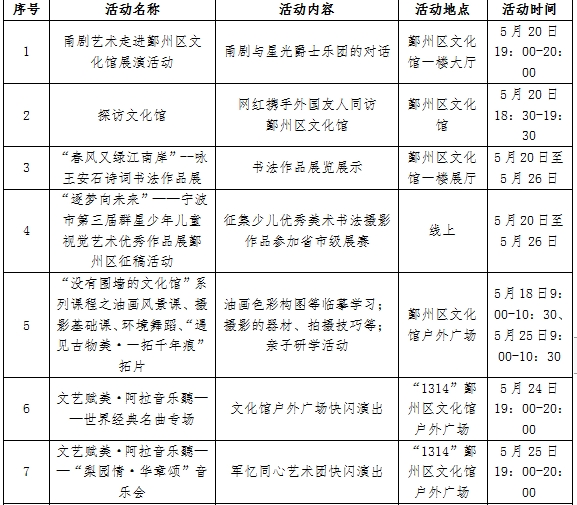 举办10场活动。20日启幕当天举办“谁说戏曲不时尚·守正创新看美育”甬剧艺术走进鄞州区文化馆展演活动。由宁波甬剧团网红流量演员苏醒为主要演员,对传统文化以现代演绎手法进行表达,并现场和外国友人进行宁波话互动。系列活动由“春风又绿江南岸”咏王安石诗词书法作品展、“没有围墙的文化馆”系列课程(油画、摄影、拓片)、“文艺赋美·阿拉音乐聽”(世界经典名曲专场和“梨园情·华章颂”音乐会)、“鄞为美”市民艺术课堂春季系列课程(吉他弹唱、HIPHOP基础、表演课、尤克里里弹唱、播音主持、JAZZ爵士舞、萨克斯演奏提高班、越剧普及课、K-POP韩舞)等组成。