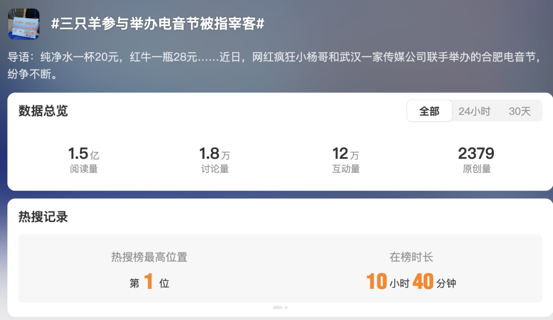 不久前,小杨哥又因为主办的电音节“物价高到离谱”被质疑宰客而登上热搜第一,有网友吐槽,活动现场,一杯纯净水卖20元,红牛和脉动则分别卖到了28元和30元一瓶。