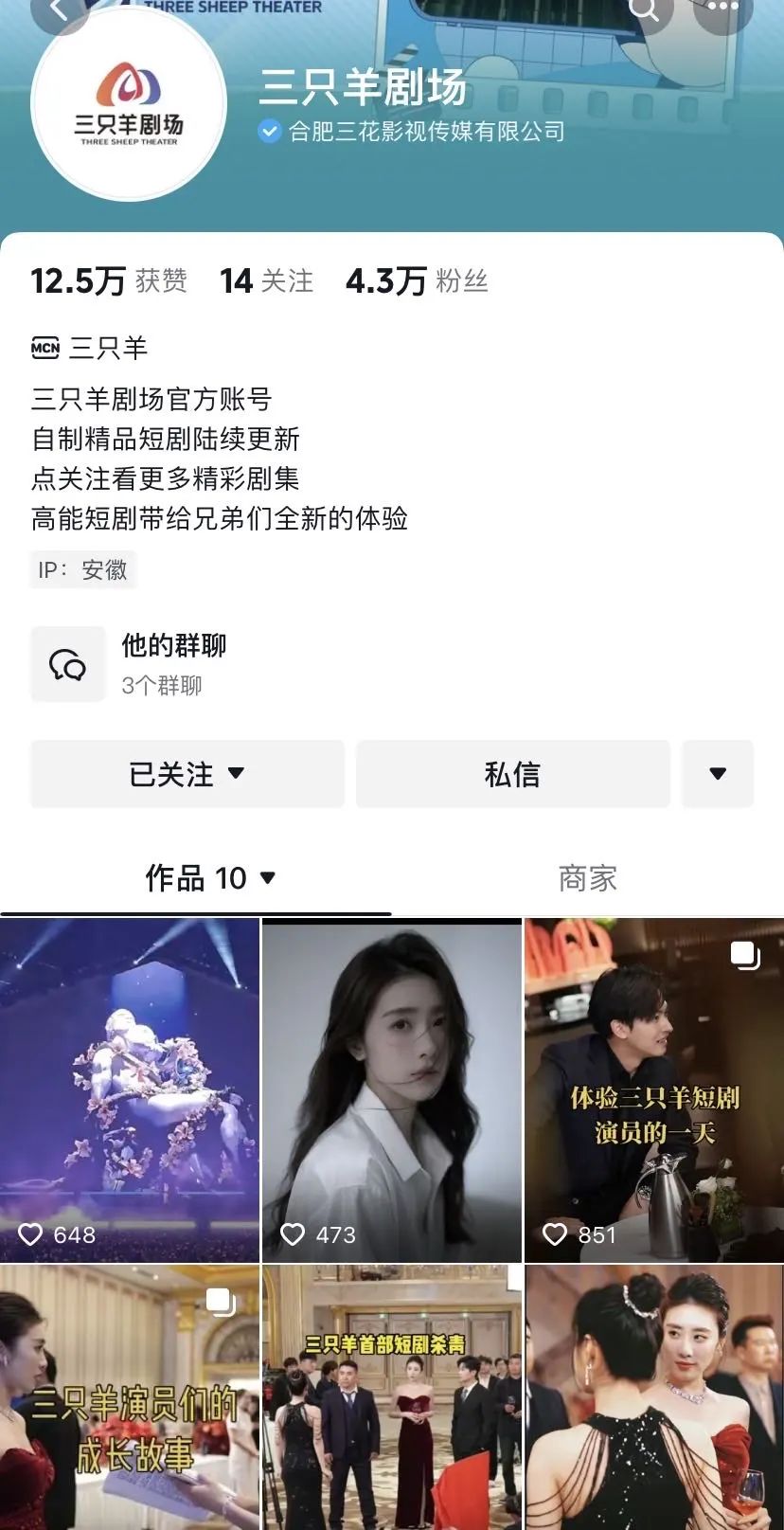 小杨哥瞄上了短剧。2月份跌出带货榜前20后,小杨哥就在直播间回应称,是为了集中精力拍摄影视片。今年4月,三只羊集团在抖音启用账号“三只羊剧场”,目前粉丝有4.3万,简介为自制精品短剧将陆续更新,并宣布首部短剧《傅爷,你的替嫁新娘是大佬》正式开拍。