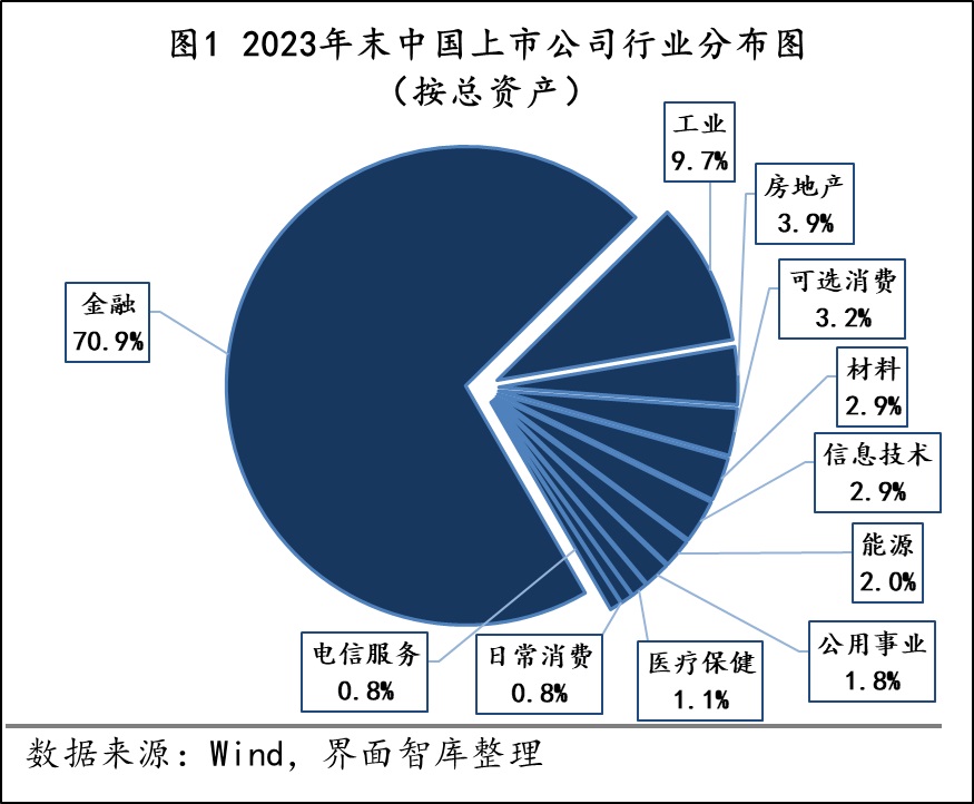 截至2023年末,中国上市公司总资产合计约为477.8万亿元。根据Wind一级行业分类,在十一个行业大类里,金融以总计338.9万亿元、占比70.9%的绝对优势排名第一;工业总计46.3万亿元、占比9.7%排名第二,这也与其在上市公司市值的排名保持一致;房地产以总计18.6万亿元、占比3.9%排名第三。此外,总资产超过10万亿元的还有三个行业,分别是可选消费15.2万亿元、材料13.9万亿元、信息技术13.9万亿元,占比分别为3.2%、2.9%、2.9%。