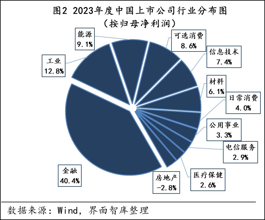 在归属于母公司股东的净利润方面,2023年,中国上市公司归母净利润合计为57625亿元,金融和工业分别以24647亿元(占比40.4%)和7783亿元(占比12.8%)稳坐第一、二名。能源以5526亿元(占比9.1%)位列第三。房地产2023年归母净利润为-1704亿元,是唯一一个净利润为负的一级行业。