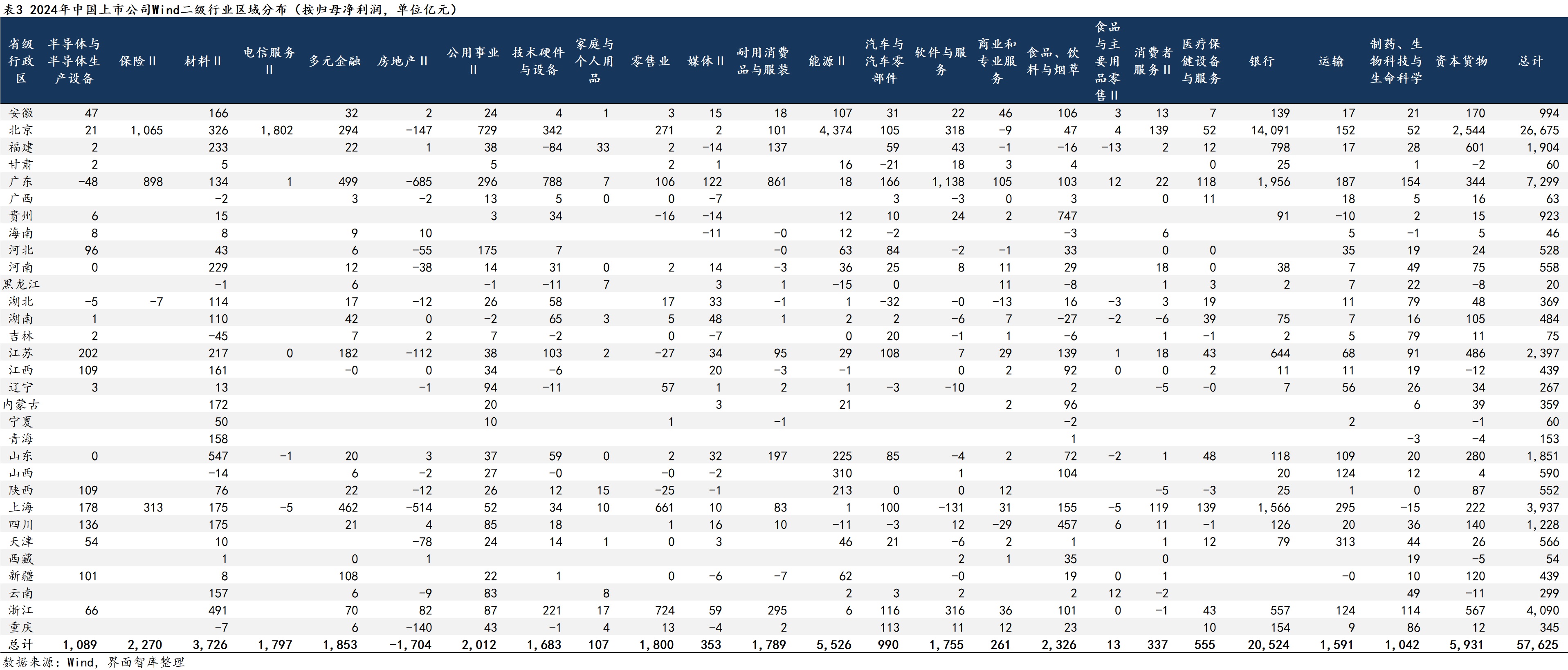 从归属于母公司股东的净利润看,银行依旧为最大贡献项,基于此项带动,北京以2.7万亿元的净利润稳坐头把交椅,广东虽受地产净利润为负的拖累但得益于保险II的优异表现,仍以7299亿元位居第二位,随后的排名与总资产和总收入情况有所不同,受到房地产以及软件与服务业净利润为负的叠加拖累,上海上市公司净利润仅有3937亿元,从第三名滑落至第四名,浙江凭借零售业的优势以4090亿元升至第三名,江苏虽也受到地产项的拖累,但仍以2397亿元的净利润排名第五。