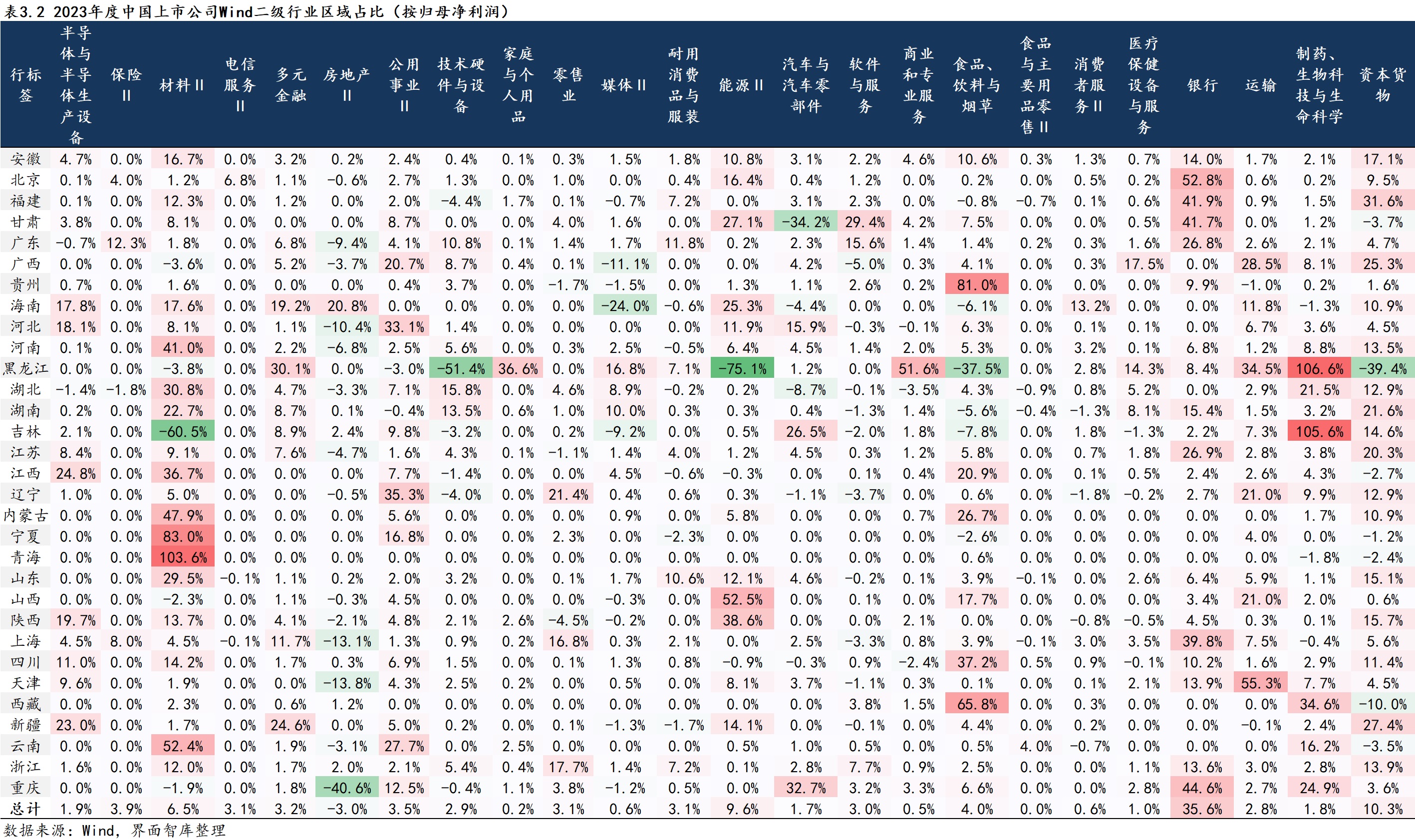 从行业净利润贡献看,制药、生物科技与生命科学在黑龙江和吉林占比分别高达106.6%和105.6%,主要贡献力量的上市公司分别是葵花药业和长春高新,材料II在青海和宁夏的占比分别为103.6%和83.0%,同样引人瞩目,不同于总收入的代表公司,对青海材料II做主要贡献力量的上市公司是盐湖股份。此外,食品、饮料与烟草在西藏占比也高达65.8%,这种优势已在总收入维度有所展示。让人略感意外的是天津的运输业,其行业占比达55.3%,在净利润的绝对数值上以313亿元排名行业第一,代表上市公司为中远海控,而向来以运输为代表的海南,在此维度却十分暗淡,净利润仅为5亿元。