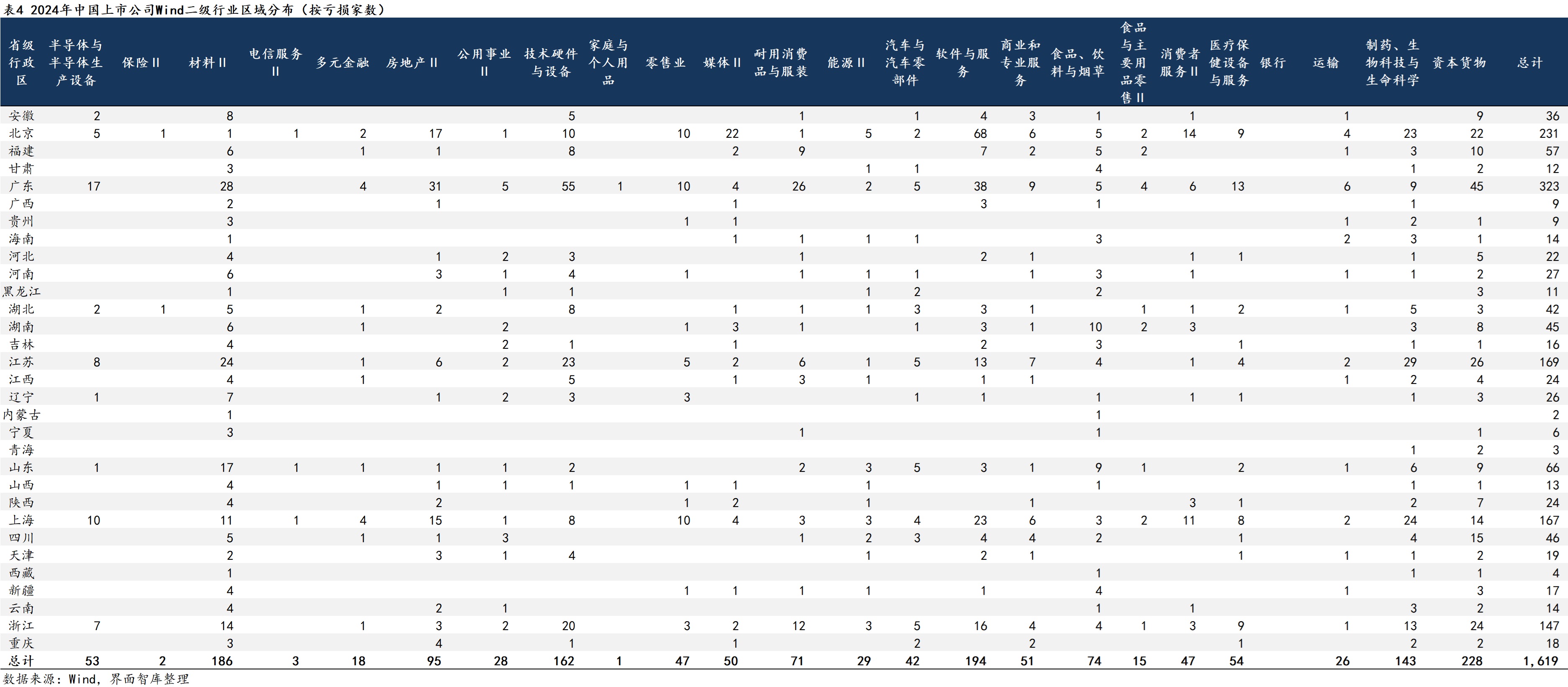 同样考虑到基数影响,亏损家数多的行业也是上市公司家数较多的行业,比如亏损家数最多的集中在资本货物领域,该行业亏损的上市公司在全国共计228家,第二、第三名分别是软件与服务(194家)、材料II(186家),从亏损家数占行业上市公司总数比看,资本货物和材料II比重在20%附近,在全国属于较低水平,不过软件与服务业的亏损家数比重达40%,高于所有二级行业,后续需持续关注该领域上市公司的财务情况。
