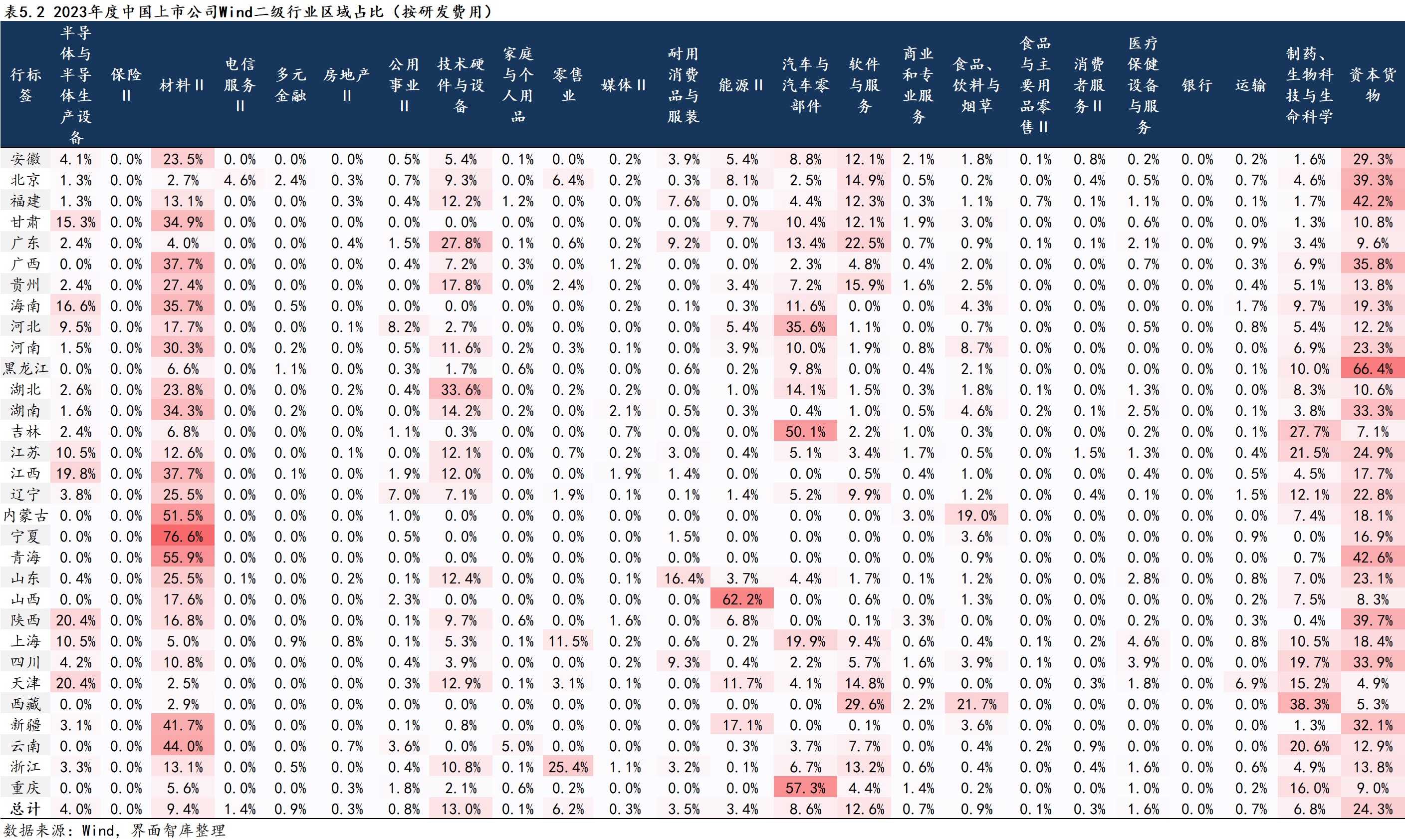 此外,材料II在青海、宁夏、内蒙古等区域占比较为显著,分别为78.9%、62.7%、53.3%,材料II主要包括化工,建材III,金属、非金属与采矿,容器与包装,纸与林木产品。多元金融在新疆以及黑龙江的占比均接近60%,其中新疆除了依靠申万宏源这家券商外,中油资本也是其主要拉动项,而黑龙江主要是受中航产融带动,该公司是由中国航空工业集团有限公司控股的金融控股类上市公司,这或为黑龙江打造航空航天产业集群蓄力。资本货物在福建的占比为52.0%,主要受建发股份和宁德时代两家公司带动。