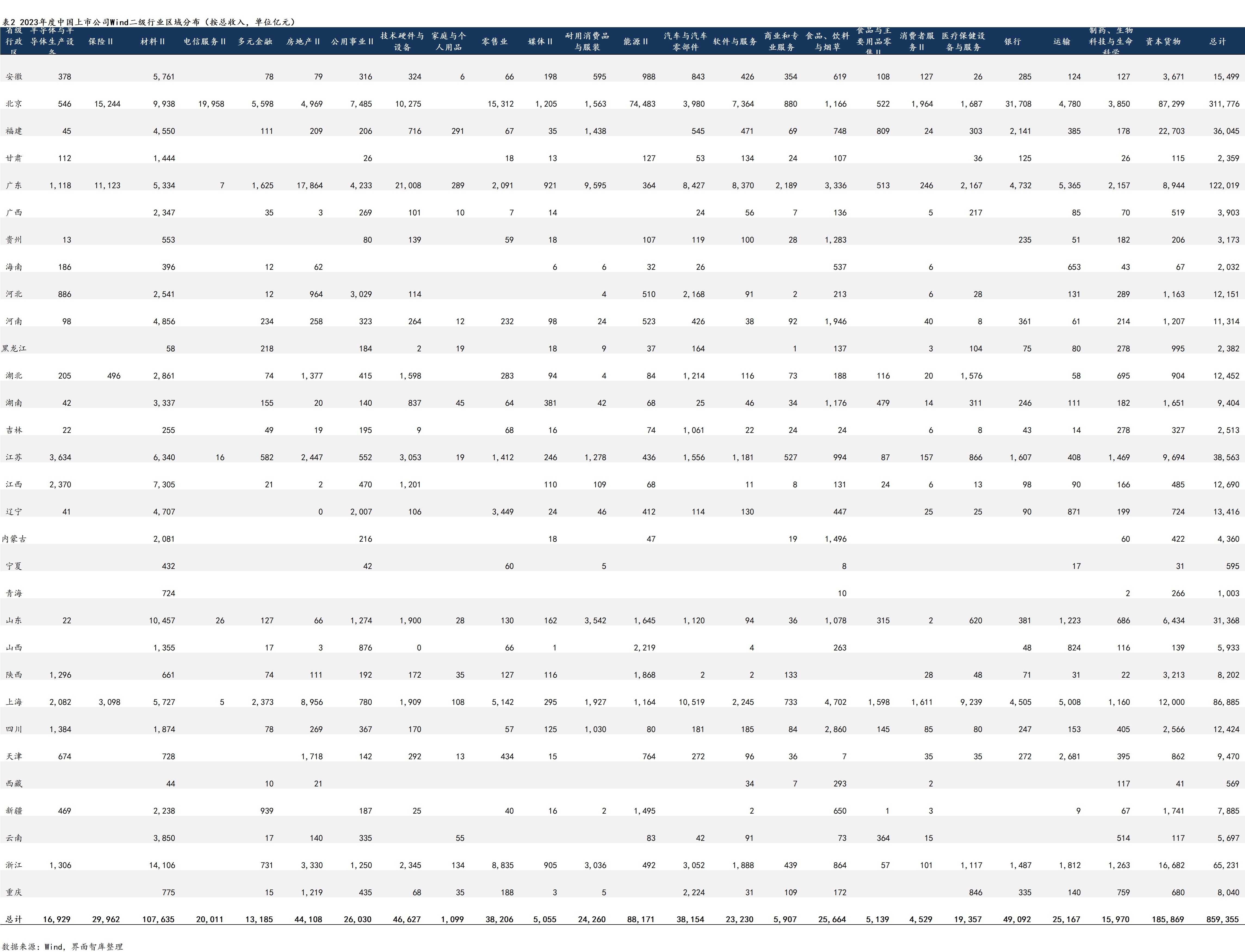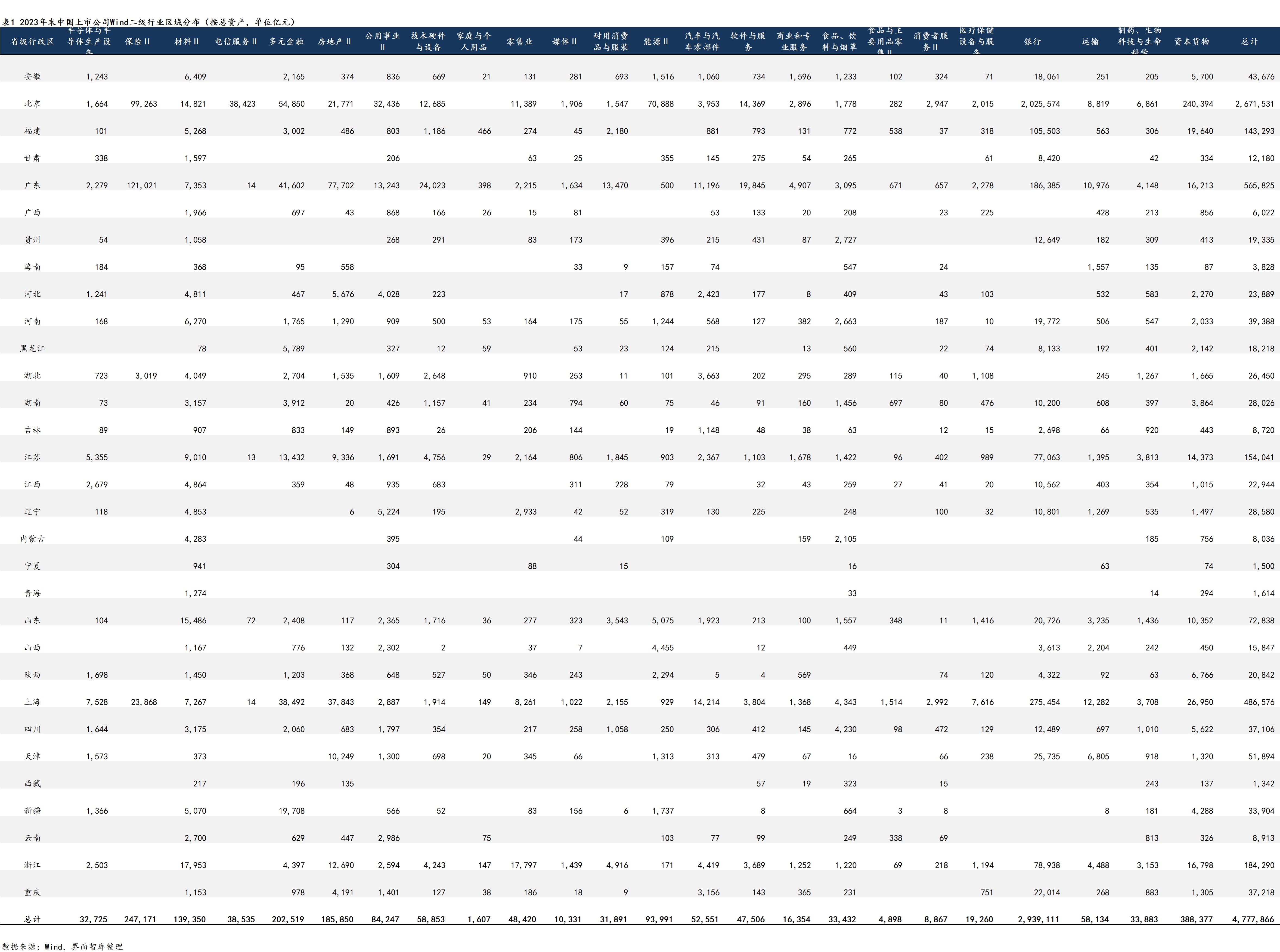 除银行业外,总资产排名第一的北京,其资本货物和保险II的表现也较为可观,北京的资本货物资产总计24.0万亿元,占该区域资产比重为37.2%,从绝对数值看,较其他省市的资本货物高出一个量级;保险II资产总计9.9万亿元,占比为15.4%,绝对数值方面,仅次于广东省的保险II。