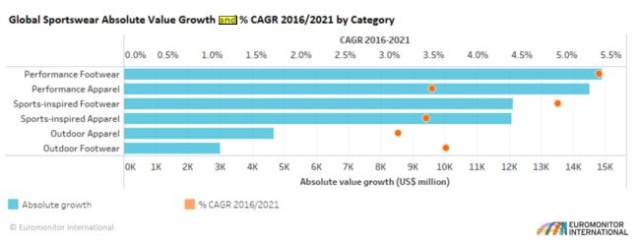 全球运动服装6.5%的增速比一般服装市场快得多,运动鞋类的增速更高达9.5%,因此Euromonitor预测,到2021年,全球运动服装价值会增加610亿美元。