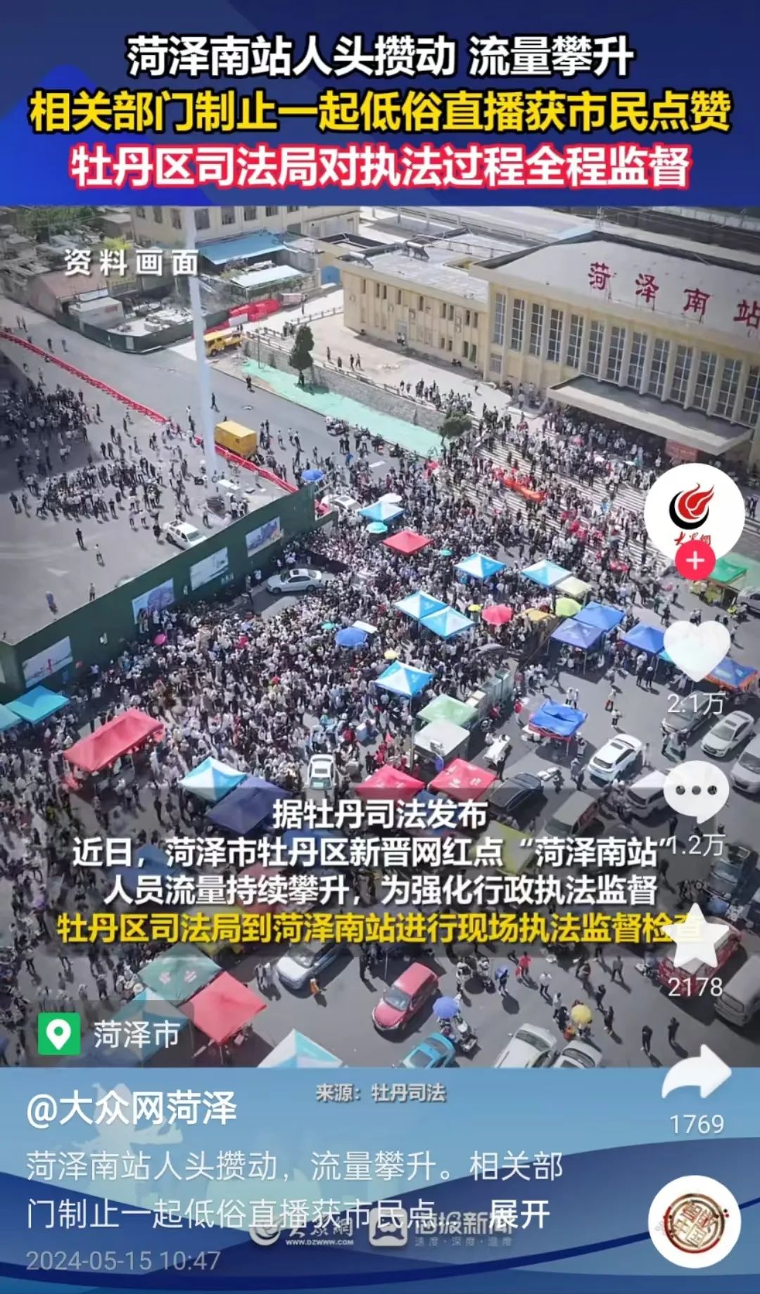 从社交平台官方及个人媒体账号发布的内容看,郭有才直播演唱地菏泽南站片区内已经人山人海,围观他直播唱歌的人里三层外三层。