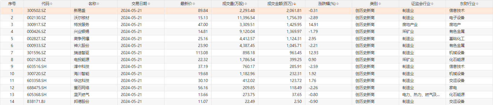 5月21日,Choice数据统计,今日共有14只个股股价创历史新高,主要分布在基础化工、有色金属等行业,包括新易盛、兴业银锡、特发服务、高争民爆等。