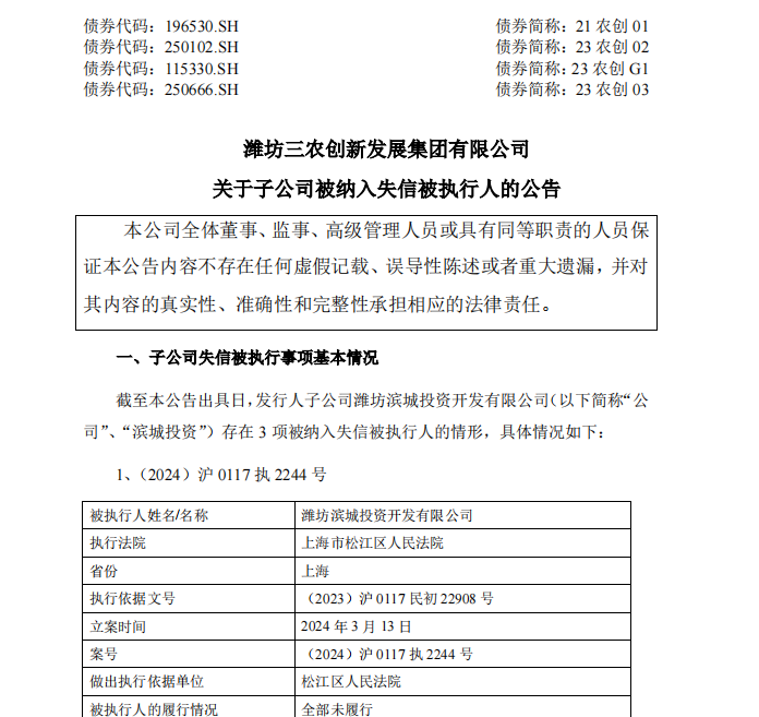 5月17日,潍坊三农创新发展集团有限公司(以下简称“潍坊农创”)发布公告,其子公司潍坊滨城投资开发有限公司(以下简称“滨城投资”)存在3项被纳入失信被执行人的情形,涉及有履行能力而拒不履行生效法律文书确定义务,以及违反财产报告制度。