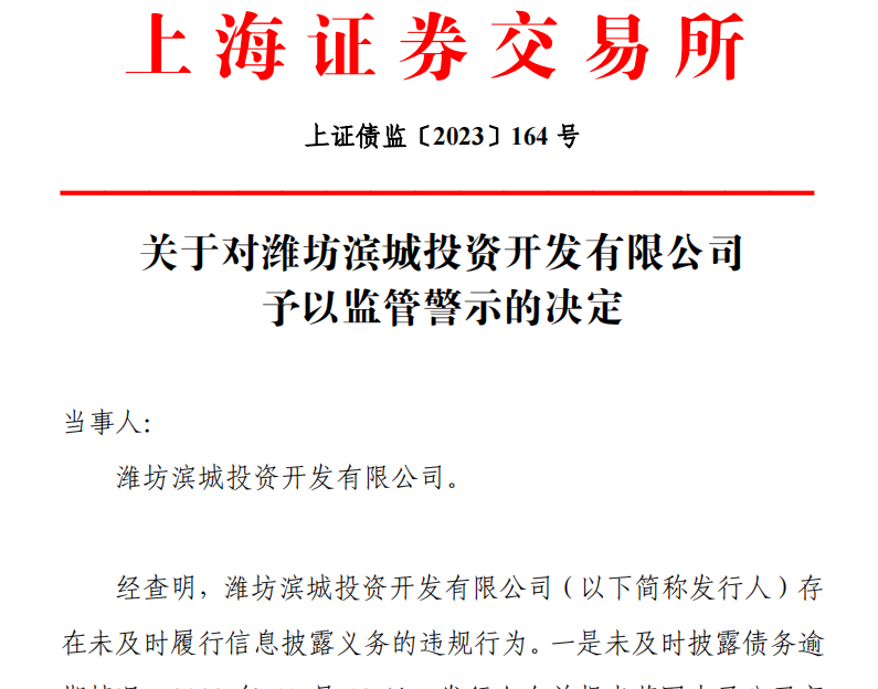 值得关注的是,2023年12月15日,上交所连发两篇公告,因存在未及时、准确履行信息披露义务的违规行为,以及未及时履行信息披露义务的违规行为,上交所分别予以潍坊三农创新发展集团有限公司、潍坊滨城投资开发有限公司监管警示。