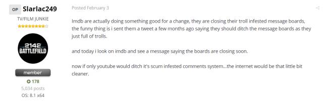 所以关闭IMDB评论区这种事儿,归根结底是一个精英化变为大众化的过程中,受到资本控制的专业与非专业之间的博弈。而原本作为影评人或资深影迷的聚集地,同时也作为他们发挥自己影响力的渠道、手段的各个网站也自然要做出调整,所以“data and traffic”是IMDb关闭评论区最为真诚的理由。