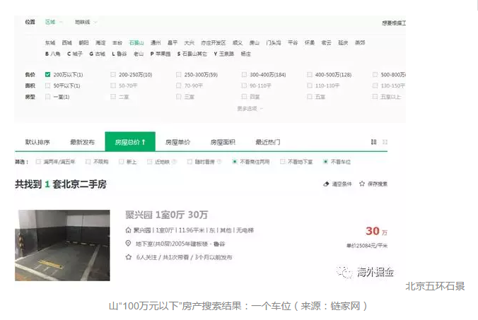 搜索结果亮了,不光“北上深”房价搜索,最低是“200万以下”起步,而且石景山附近100万元以下的,只找到了一个车位!