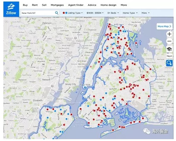 下图是我们将房价范围锁定在14-16万美元,地图上展示的搜索结果。可以看到,符合这一价位的房源有不少。