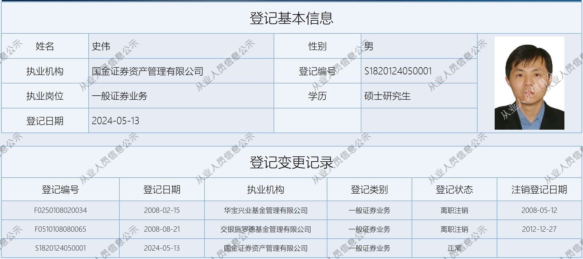 中基协备案信息显示,史伟在博道基金登记信息于2024年5月9日发生变更,随后于5月10日登记入职国金资管。5月13日,史伟在中证协完成国金资管登记。