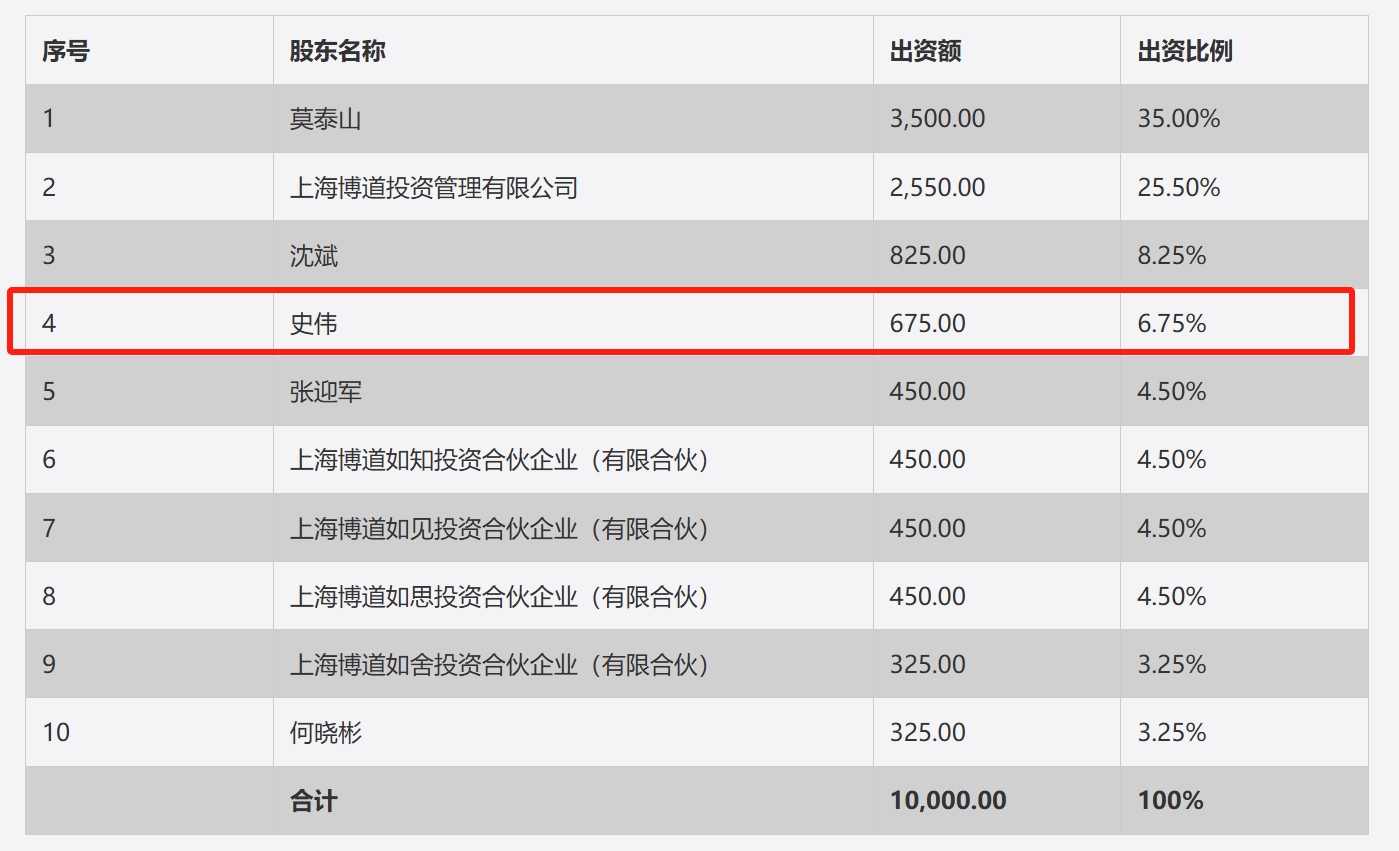 作为博道基金创始成员之一,博道基金官网显示,史伟持有公司6.75%股份,为公司第四大股东。