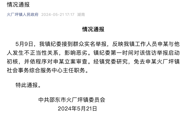 中共邵东市火厂坪镇委员会5月21日通报:5月9日,我镇纪委接到群众实名举报,反映我镇工作人员申某与他人发生不正当性关系,影响恶劣。镇纪委第一时间对该信访举报启动初核,并依程序对申某立案审查。经镇党委研究,免去申某火厂坪镇社会事务综合服务中心主任职务。