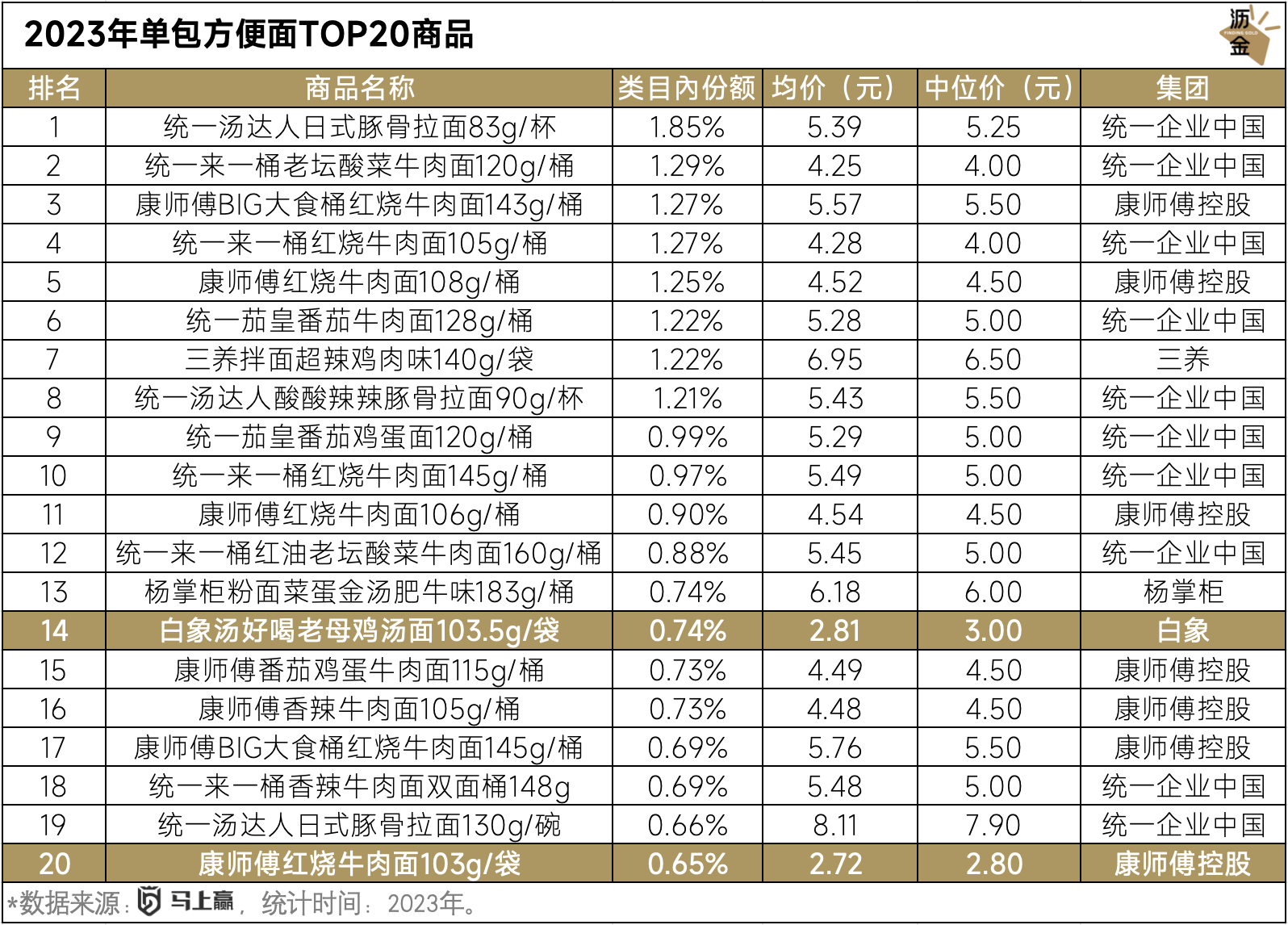 纵观2023年线下TOP20方便面销量榜里,只有“白象汤好喝老母鸡汤面”和“康师傅红烧牛肉面”这两个袋装产品均价低于3元,其他的桶面、杯面价格大都在4.5~5.5元的价格区间。