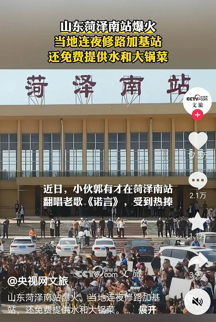 2024年5月17日,郭有才被菏泽文化旅游聘为菏泽文旅推荐官。据抖音生活服务数据显示,5月10日至5月12日,菏泽的抖音生活服务订单比去年增长215%。据官方数据统计,菏泽南站如今日均接待游客超40万人次。