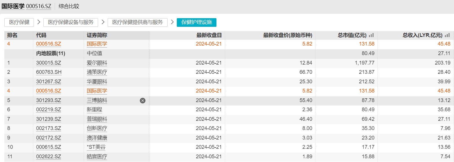 Wind数据显示,根据最新收盘股价、总市值(亿元)、总收入(亿元)、净利润(亿元)、ROE(%)、Beta(最近100周)多项指标综合比较,国际医学在同业综合比较中排名第4位。