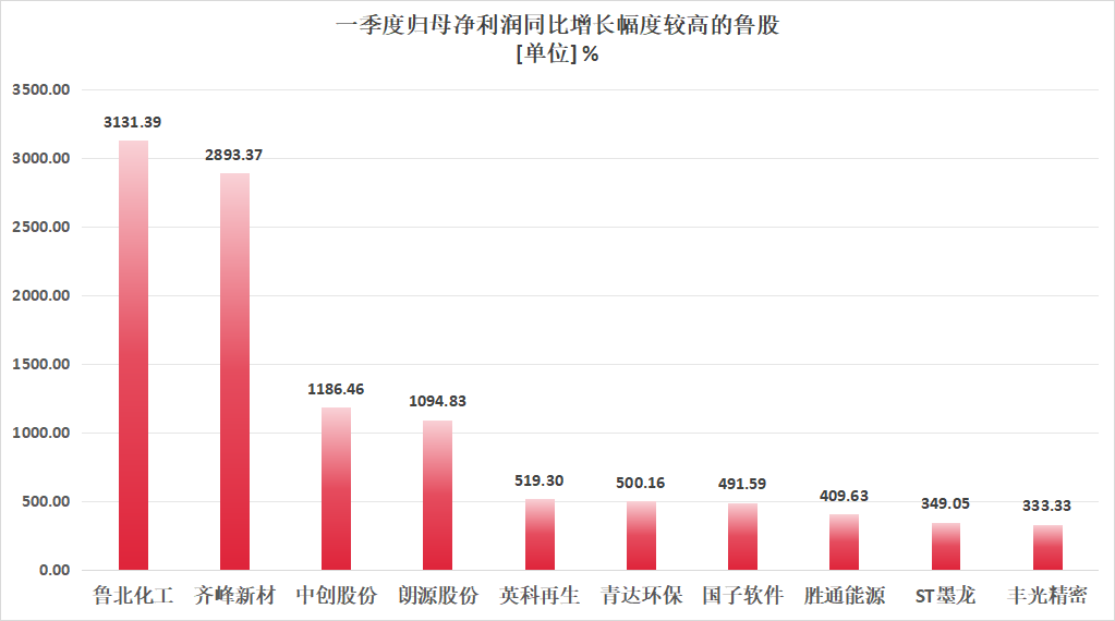 当然,就整个山东板块来说,今年一季度归母净利润增速最快的还要数鲁北化工(600727.SH)。这家化工企业受益于钛白粉产品、烷氯化物产品同比收入增加,实现归母净利润5054.14万元,同比增幅高达3131.39%。位居其后的是齐峰新材(002521.SZ),公司一季度实现归母净利润5118.07万元,同比增长2893.37%。