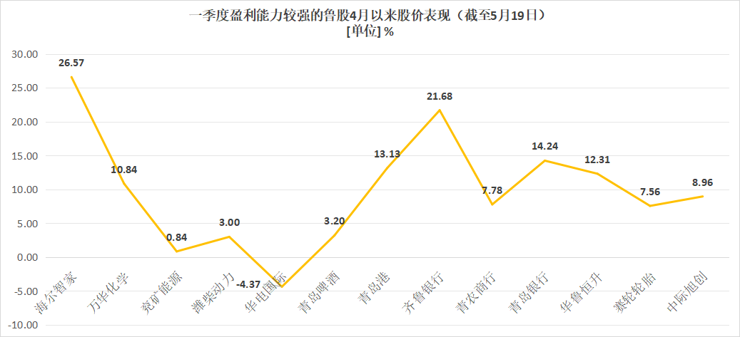 值得注意的是,上述业绩表现向好的个股,4月以来(截至5月19日)股价表现也颇为积极。其中,盈利能力较强的个股,股价表现更为稳定。如一季度盈利超过10亿元的13只鲁股中,4月以来只有华电国际的股价出现了4.37%的回落,其余鲁股的股价均出现上涨。