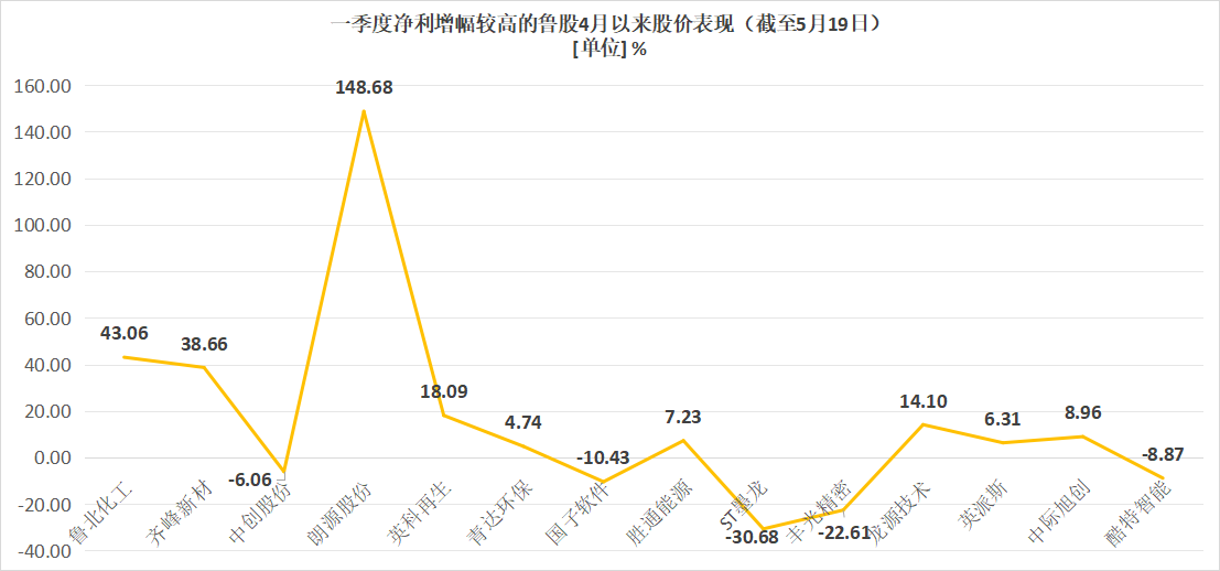 与之相比,一季度归母净利润同比增长超100%的鲁股中,虽然4月以来股价表现涨跌互现,但是波动幅度明显增大。