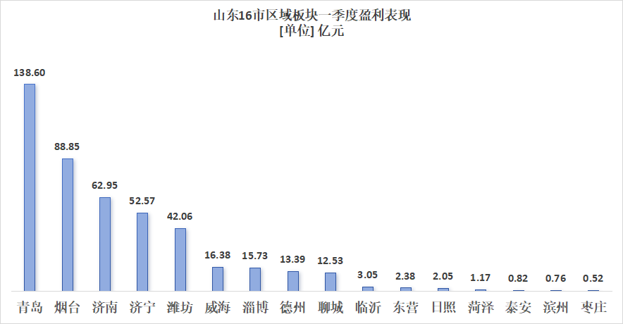 济宁、潍坊、威海位居4至6位,一季度实现归母净利润分别达到52.57亿元、42.06亿元、16.38亿元。淄博、德州、聊城板块一季度实现的归母净利润均为10亿元级别。