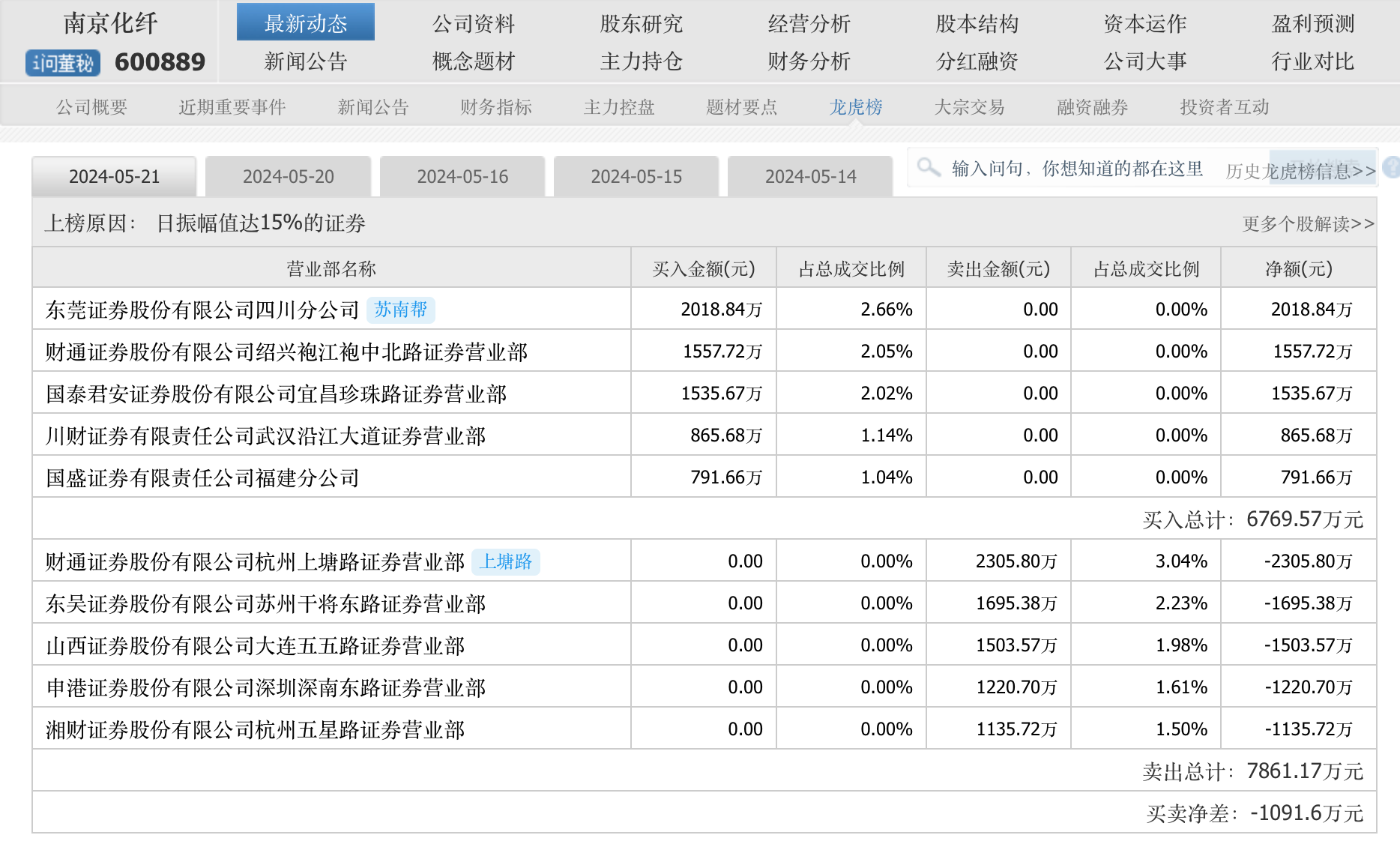 5月10日至5月17日,南京化纤6个涨停,引起市场高度关注。资金通过财通证券杭州上塘路营业部等在其中游走。