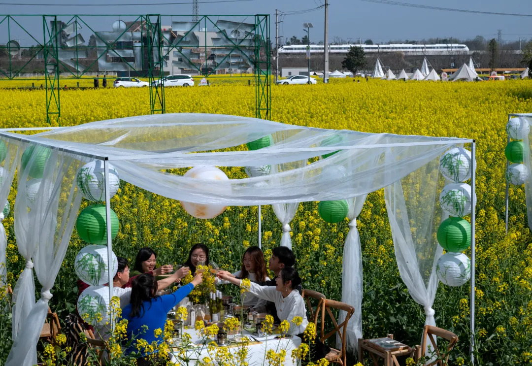 不仅如此,许多团建公司顺势推出春日主题团建活动,市民可以现场体验樱桃、桑葚的采摘,参与春日手工活动,吃春日餐食。不仅如此,作为中国乡村旅游“农家乐”的最早发源地,成都向来“很会玩”——许多消费者还体验到山顶梅花树下沉浸式露营、在油菜花地里畅享火锅,在成都各区“处处盛开”,成了这个春季最受欢迎的消费场景。