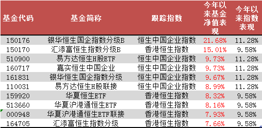 从上图可以看到,目前挂钩恒生指数与恒生国企指数的基金共有10只,其中包括两只分级B产品。上表中今年以来净值增长幅度最大的是银华恒生国企指数分级B(150176),净值涨幅与场内涨幅均超过20%。
