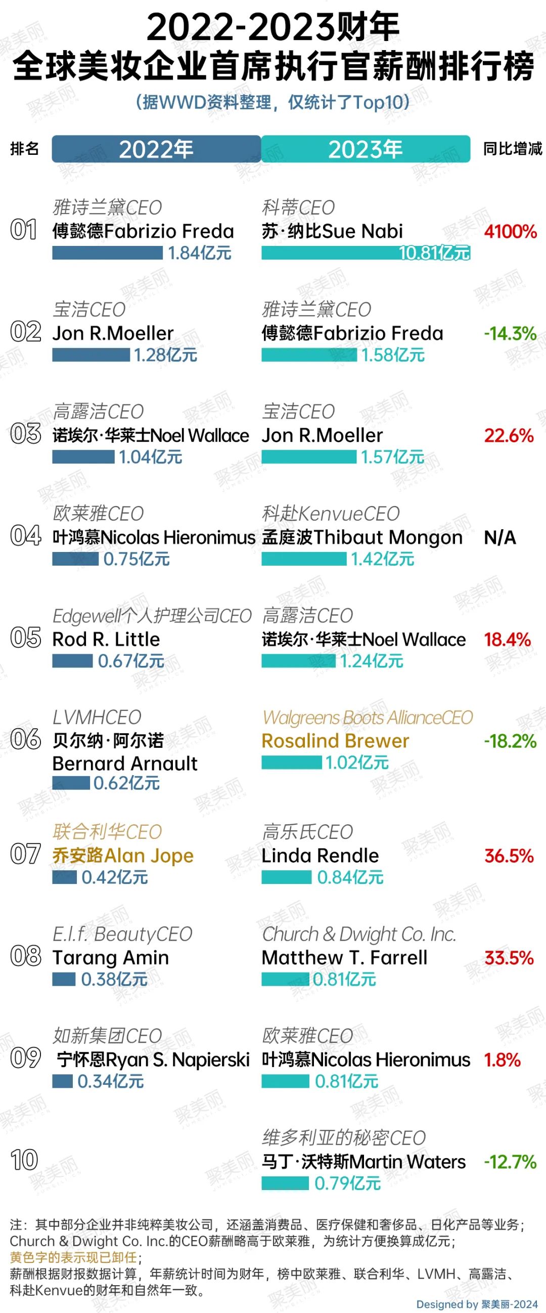 对比2022财年与2023财年的榜单,不难发现,2023财年榜中的美妆CEO多数涨薪,同时美妆巨头们的业绩表现也间接影响了CEO薪酬水平。
