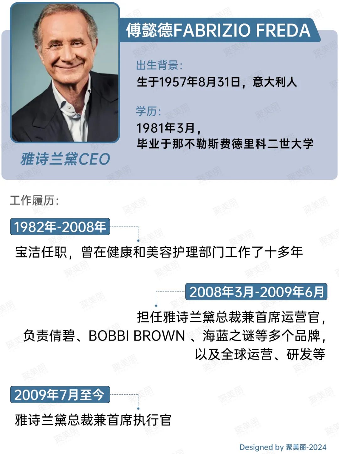 据了解,傅懿德Fabrizio Freda为1957年出生的意大利人,毕业于那不勒斯费德里科二世大学。在加入雅诗兰黛之前,1982年-2008年,傅懿德Fabrizio Freda任职于宝洁,曾在健康和美容护理部门从业十多年。