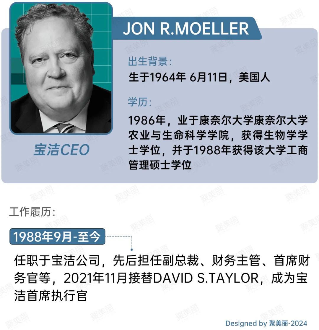 求学历程结束后,1988年 Jon R. Moeller便进入宝洁,任职至今,先后担任副总裁、财务主管、首席财务官等职位,2021年11月被提拔为首席执行官。