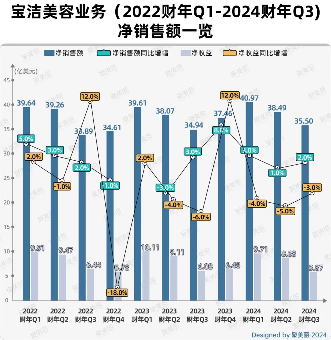 虽说如此,Jon R. Moeller任CEO期间,宝洁美容业务的发展较为低迷。2022财年Q1-2024财年Q3(2021年7月-2024年3月),宝洁美容业务增速放缓,最近3季度净收益连续下滑。