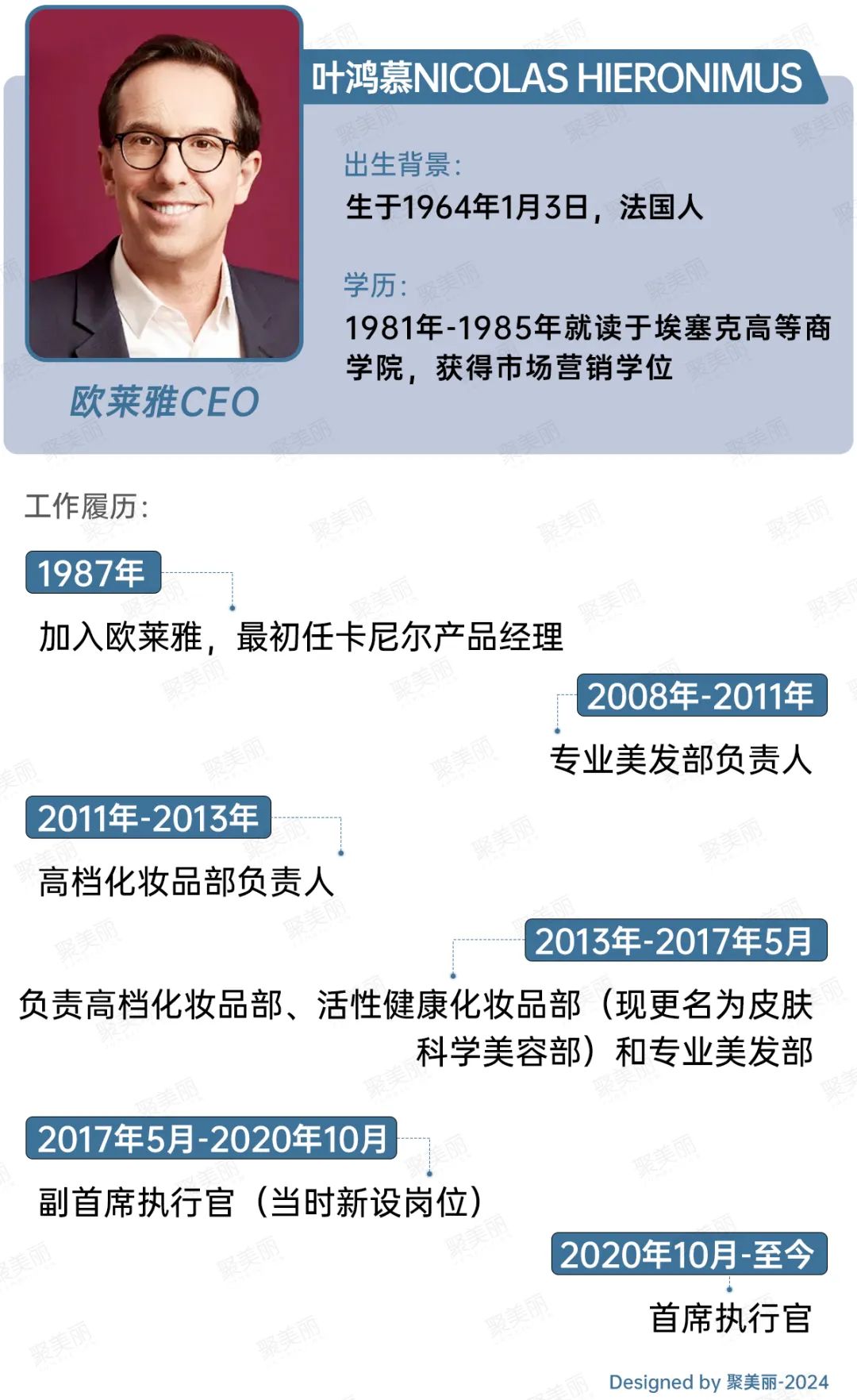 2017年5月,欧莱雅有意培养叶鸿慕Nicolas Hieronimus接班,升迁他为副首席执行官(注:新设岗位),2020年10月,他正式上任。