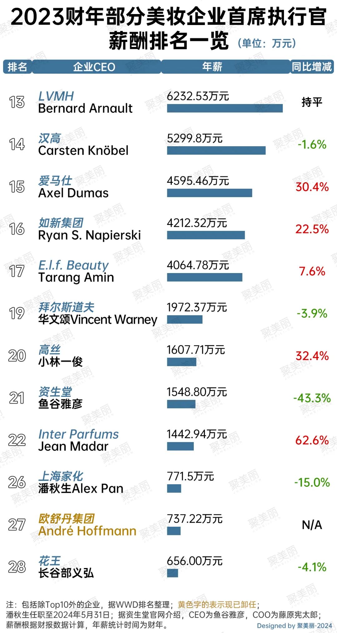 另外,随着今年高德美、Puig等巨头的上市,其上市当日市值便赶超资生堂等企业。这意味着,在越来越多美妆企业资本化后,2024财年的首席执行官薪酬榜单或将迎来更大的变化。