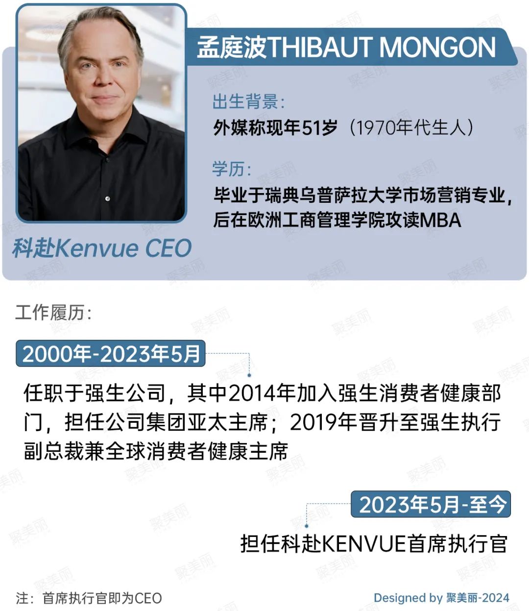 在就任CEO之前,孟庭波Thibaut Mongon前东家为强生。他在2000年-2023年5月期间,就职于强生;2014年后深耕于大健康产业——加入强生消费者健康部门,担任集团亚太主席;2019年晋升至强生执行副总裁兼全球消费者健康主席。