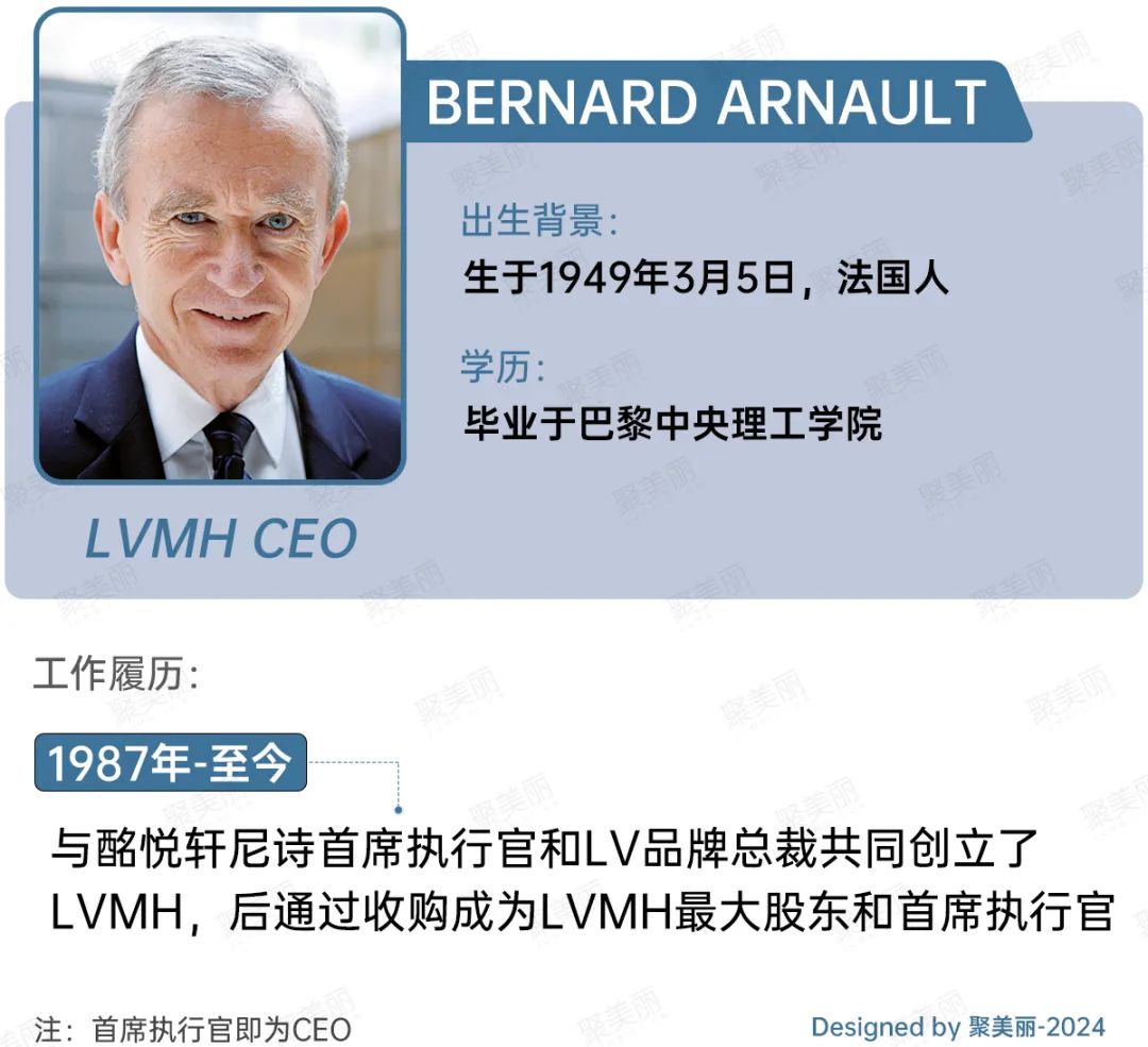 1987年,Bernard Arnault与酩悦轩尼诗首席执行官和LV品牌总裁共同创立LVMH,后通过收购股权或股票成为LVMH最大股东和首席执行官。