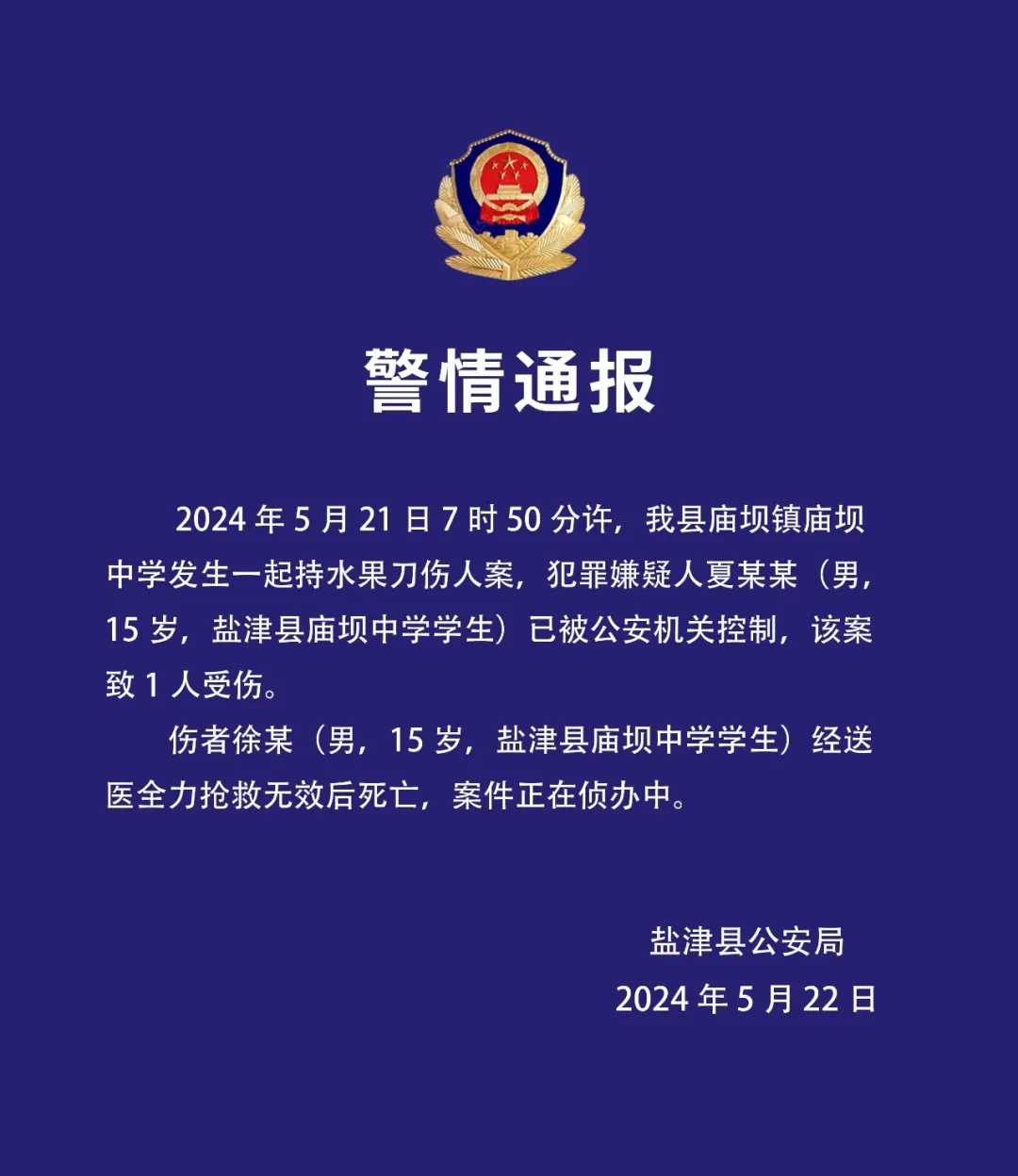 云南盐津县公安局通报,5月21日7时50分许,盐津县庙坝镇庙坝中学发生一起持水果刀伤人案,犯罪嫌疑人夏某某(男,15岁,盐津县庙坝中学学生)已被公安机关控制,该案致1人受伤。伤者徐某(男,15岁,盐津县庙坝中学学生)经送医全力抢救无效后死亡,案件正在侦办中。