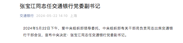据交通银行微信公众号消息,5月22日下午,受中央组织部领导委托,中央组织部有关干部局负责同志出席交通银行干部会议,宣布中央决定:张宝江任交通银行党委副书记。