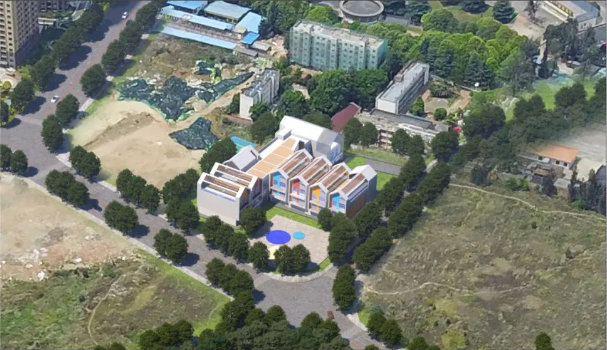 从项目位置以及效果图查证可知,该所新建幼儿园或为山海湾金澜锦翠项目自身配建的两所幼儿园之一,用地面积约10.53亩,拟建1栋3层幼儿园及1层地下室。