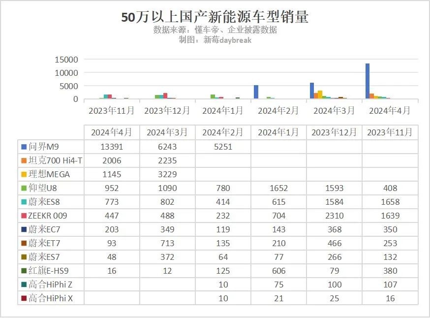 目前,这两款车型表现还不错。仰望U8在开启交付的第二个月,销量达到1593辆。在百万级豪车领域,算是达到了平均水平。问界M9首月交付5251辆,在刚刚过去的4月,交付13391辆,拿下了50万以上不分车型和能源形式的豪华车榜首。