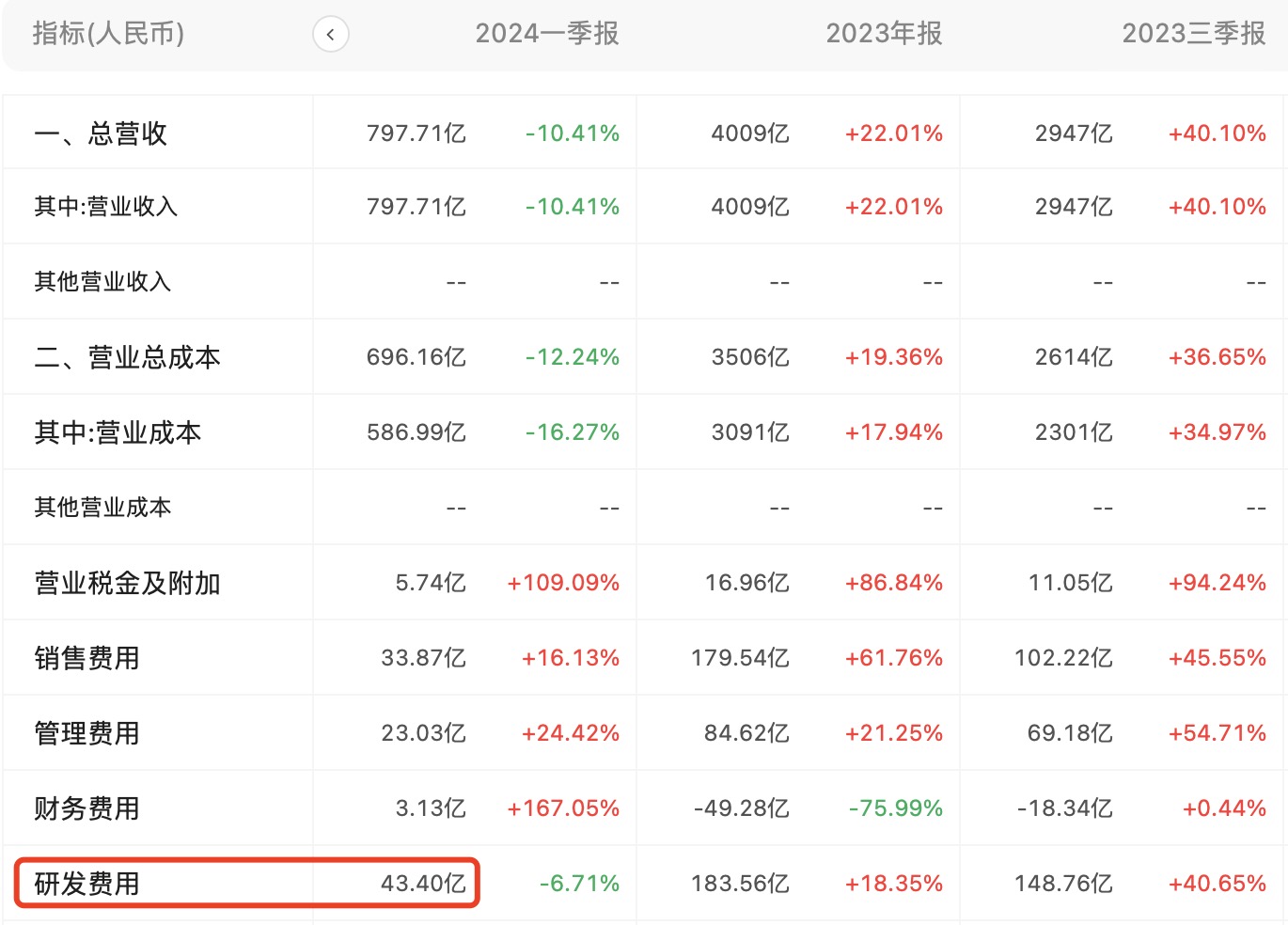 据悉,宁德时代从来不吝在研发上投入,2023年的研发投入就达到183.56亿元,而2024年一季度的研发费用为43.4亿元,数倍于同行。