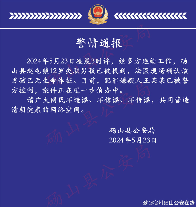 砀山县公安局通报,5月23日凌晨3时许,经多方连续工作,砀山县赵屯镇12岁失联男孩已被找到,法医现场确认该男孩已无生命体征。目前,犯罪嫌疑人王某某已被警方控制,案件正在进一步侦办中。