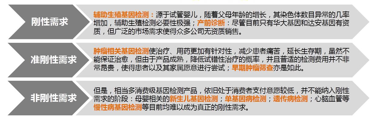 对于市场接受程度,据调研显示,整体来看辅助生殖、孕妇产前、肿瘤个体化治疗和肿瘤早期筛查产品的市场接受程度较高;而消费者为新生儿、单基因病、遗传性肿瘤预测等检测项目买单的意愿较低。其实,两者的差异就在于是否为“刚需”,对于那些刚需和准刚需的产品,市场需求较为旺盛,而对于疾病预测类的产品,由于只能“提出问题而不能解决问题”,消费者有宁愿不知的心态,具体分析如下。
